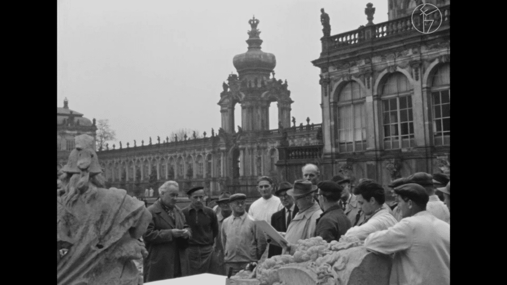 Die Werkschau startet mit dem Amateur-Kurzfilm „Das schöne Dresden“ von Gerhard Schneider aus dem Hirsch-Archiv von 1936. Ernst Hirsch selbst erlebte die Zerstörung einige Jahre später als Neunjähriger mit. Erste Schritte als Kameramann ging er in den Ruinen der Stadt; mit 16 Jahren filmte er die Sprengung der ersten Carolabrücke, beziehungsweise dessen, was von ihr nach dem Krieg noch übrig war. Doch Hirschs besonderes Augenmerk galt dem Wiederaufbau: Über Jahre hinweg dokumentierte er die Arbeiten im Zwinger, die Rekonstruktion der Katholischen Hofkirche und die Neugestaltung des Areals rund um den Altmarkt.